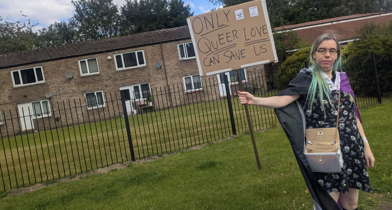 We started our pride because we wanted to do something radical. We wanted to start a movement. We want people to be proud of Wythenshawe and where they've come from.Wythenshawe is for all. The people of Wythenshawe do not judge. We help the poor and needy, and the sick, no matter their background. We help those who flee from the worst life stories. We know eachother's life stories.We think it doesn't need gentrifying. We don't want changes on Wythenshawe forced on us. Civic is fine as it is, it just needs new paint, on-the-street art exhibitions from local artists, nice plants and trees, events, open shops and new paving.And it needs a bit of civic love. That's what we've set out to do here.We both yelled into the streets as loud as we could, shouting "We love Wythenshawe!" and "Wythenshawe Pride is coming to your homes!" and "There is still time!" to try and inspire the public into some action and bring back that Wythenshawe Spirit.Emily sung in her sapphic punk style Anarchy in the UK in a thunderous voice to trams, cars, ambulances, police cars, passersby, and anyone who wanted to listen. ixcaliber made the placards we paraded around from Shadowmoss to Civic to Benchill, and we went onto the Metrolink network.And we both did something that has never been done in Wythenshawe's history before, as far as we can tell.We will schedule another pride soon.Work alongside us. Not against us.There is still time.- Emily Chomicz & ixcaliber, and the Love Transcends Hate collective
